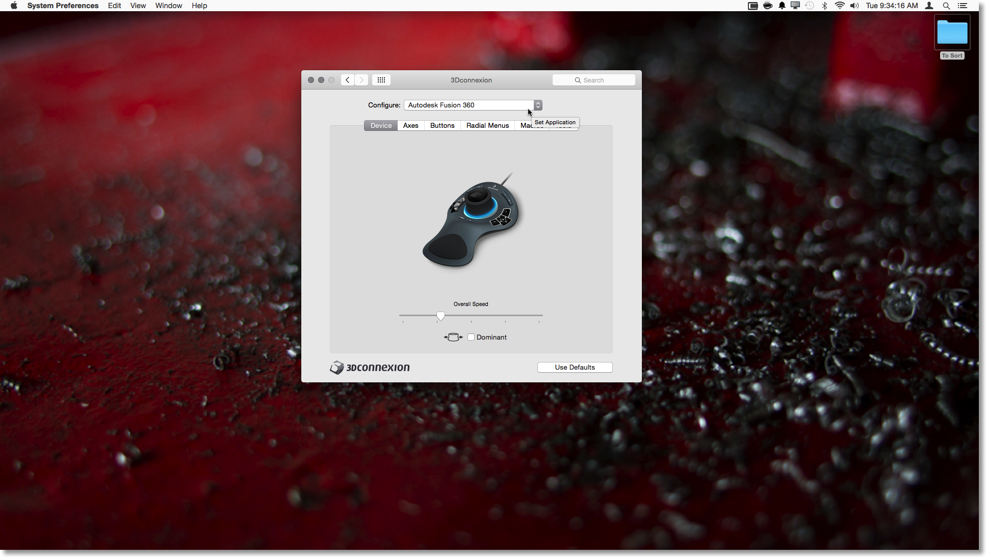 Launch the 3DConnexion settings. On OS X you will find these in the system preferences.