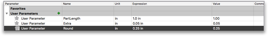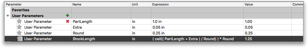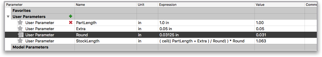 We want to control if Fusion 360 rounds to .125, .25, .5 or 1.0in increments so we create a parameter called Round and make it .25in.